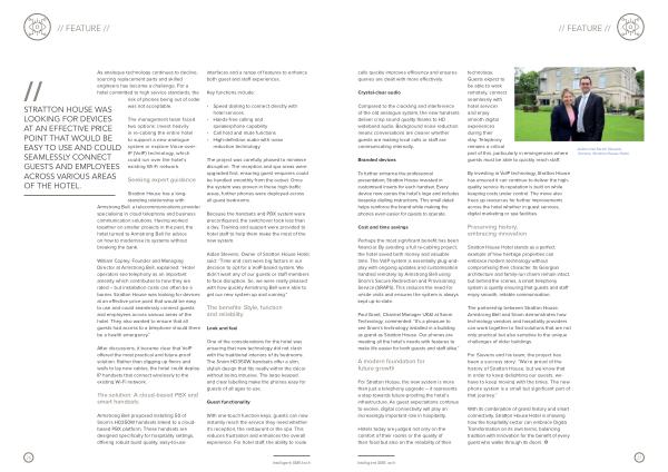 Armstrong Bell proposed installing 50 of Snom’ s HD350W handsets linked to a cloudbased PBX platform. These handsets are designed specifically for hospitality settings, offering robust build quality, easy-to-use interfaces and a range of features to enhance both guest and staff experiences.