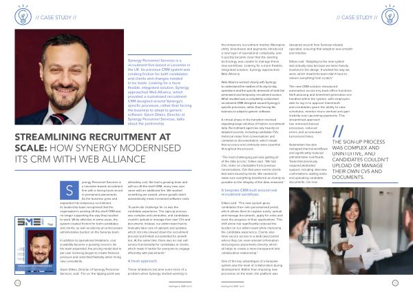 S a Leicester-based recruitment firm with a strong track record in permanent placements. As the business grew and expanded into temporary recruitment, its leadership team recognised that the organisation’ s existing off-the-shelf CRM was no longer supporting the way they needed to work. While effective in some areas, the system created friction for both candidates and clients, as well as placing an unnecessary administrative burden on the Synergy team.